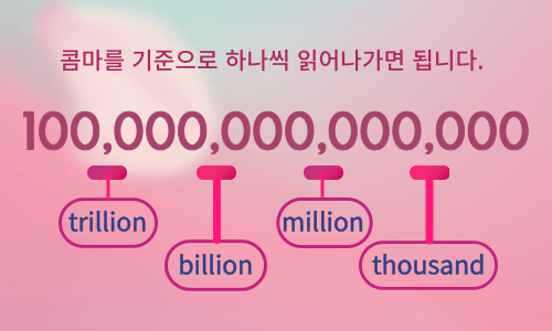 영어 숫자 단위 백, 천, 만, 십만, 백만, 억, 십억, 조 순으로 알아보겠습니다. 100부터 시작되는 큰 단위의 숫자는 천 단위 콤마부터 끊어서 읽어주면 헷갈리지 않습니다.