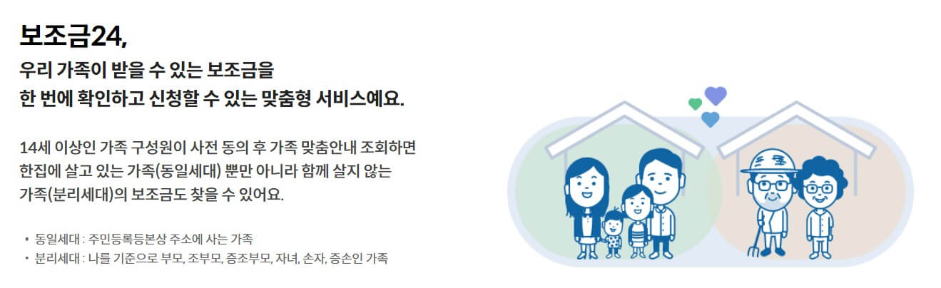 보조금 24는 나와 우리 가족이 받을 수 있는 각종 보조금을 확인하고 신청까지 할 수 있는 원스톱 서비스입니다. 정부에서 직접 운영하는 정부 24를 통해 내가 받을 수 있는 혜택을 쉽고 편리하게 확인할 수 있을 뿐만 아니라, 14세 이상인 가족 구성원(분리세대 포함)의 사전동의가 있으면 가족 전체 맞춤 안내 조회로 보조금을 확인할 수 있습니다.