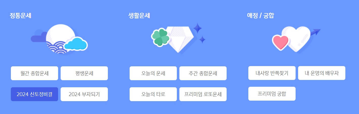 아시아경제에서는 2024 신년운세는 물론이고 정통사주, 토정비결, 결혼·이사 택일 등 다른 사이트에 비해 좀 더 디테일한 내용을 확인하기 좋습니다. 이밖에 정통사주, 당사주, 궁합도 함께 확인할 수 있으니 결혼을 앞둔 자녀가 있거나 이사이동 계획이 있어 택일을 해야 하는 경우 활용하기 좋겠습니다.