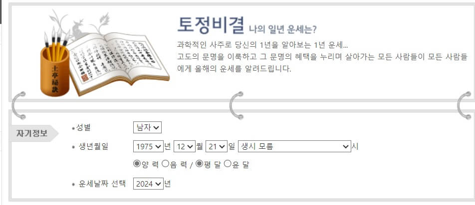 신한라이프 무료운세 접속하면 2024년 신토정비결이 있습니다. 생년월일과 시를 입력 후 운세 보기 클릭하면 신년 토정비결 내용을 손쉽게 확인할 수 있습니다.