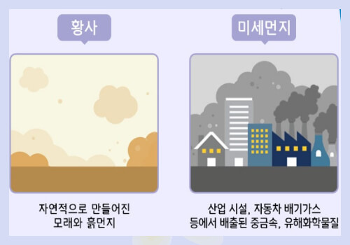 봄철에 주로 발생하는 황사는 자연적으로 발생하는 모래와 흙먼지입니다. 주로 중국 북부나 몽골지역에서 미세한 흙먼지가 바람에 날아오는 것이데요. 옛 기록에 따르면 삼국시대에도 황사로 흙비가 내렸다고 전해집니다. 미세먼지는 산업시설과 자동차 배기가스에서 배출된 중금속과 화학물질로 구성된 먼지를 말합니다. 황사와 미세먼지는 발생 원인과 구성성분이 서로 다르지만 건강에 좋지 않은 영향을 줄 수 있으니 조심하는 것이 좋습니다.